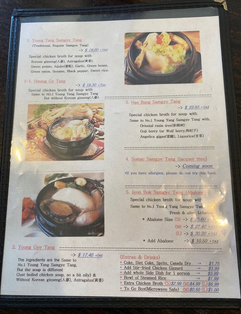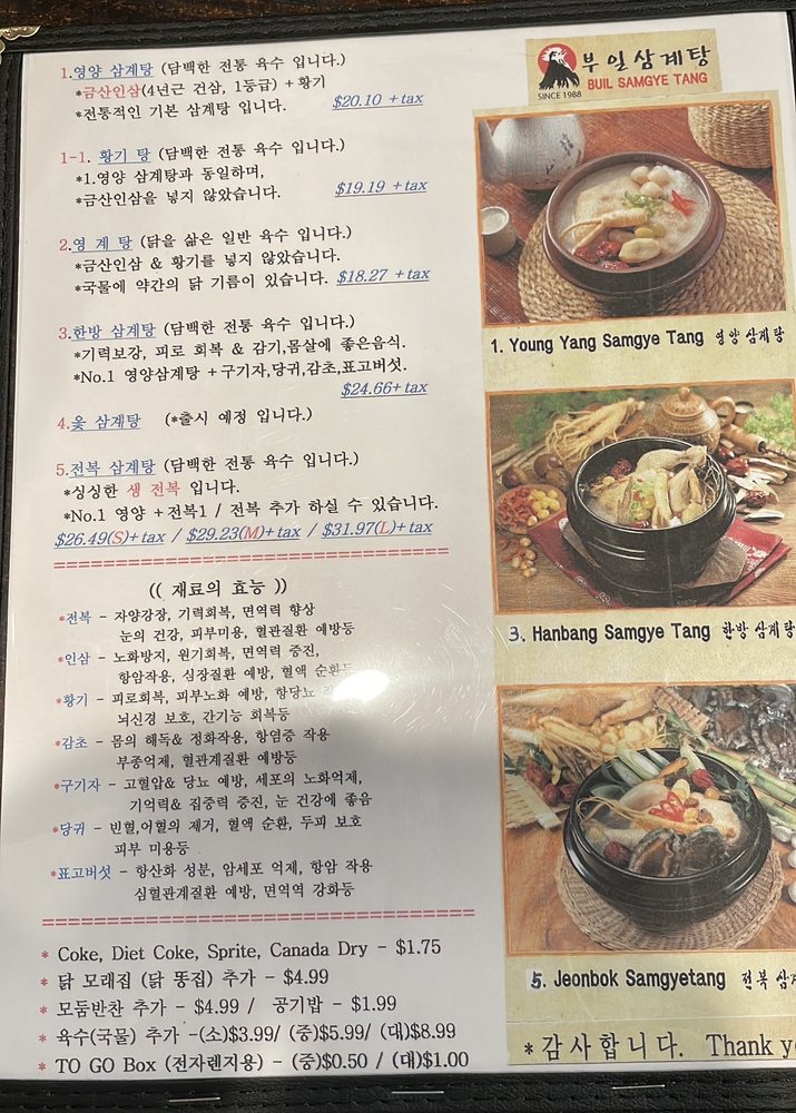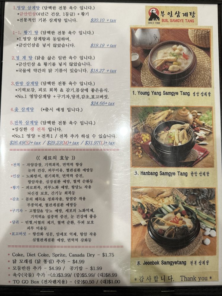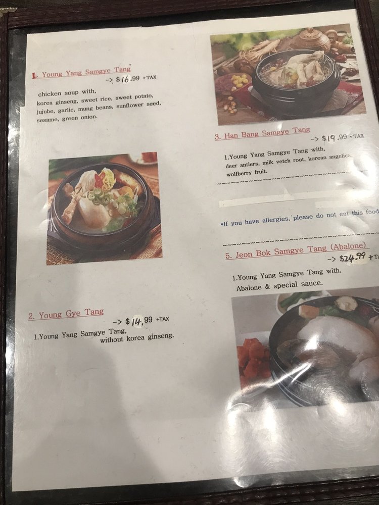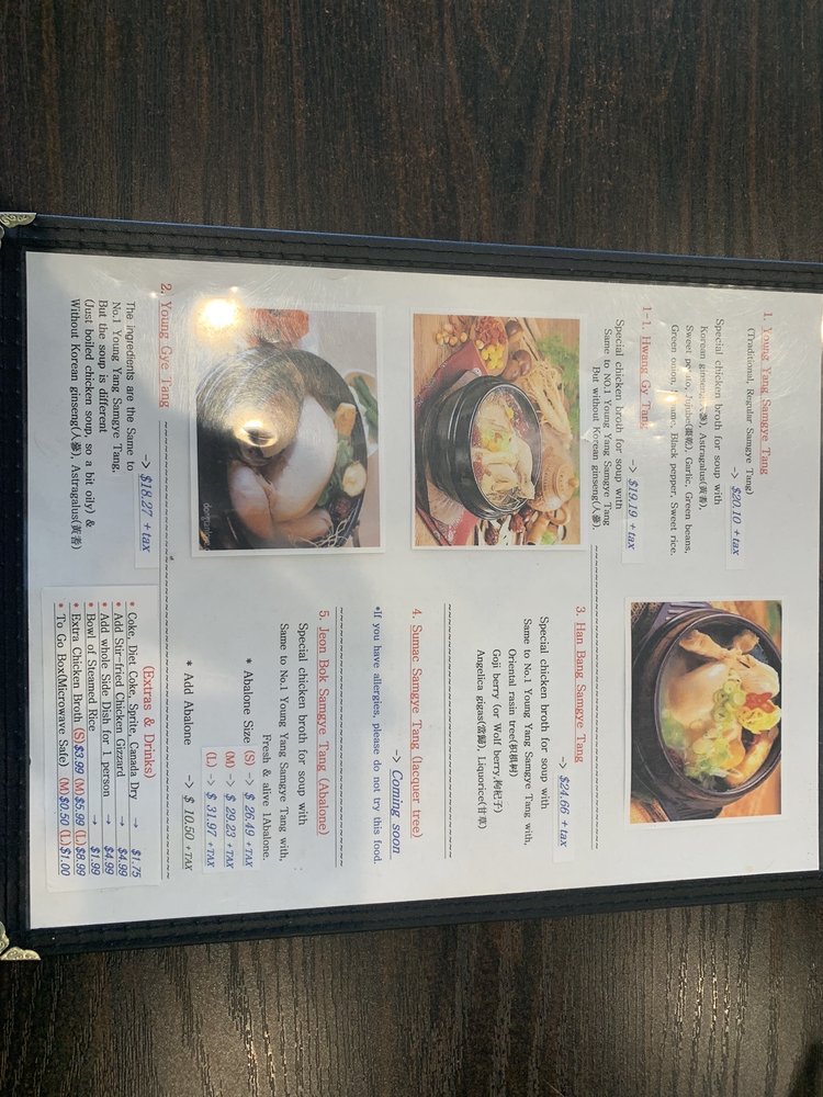The ingredients are the same to No. Young Yang SamGye Tang, but the broth is different (Just boiled chicken soup WITH NO Korean Ginseng(), Astragalus() It could be a little bit oily)